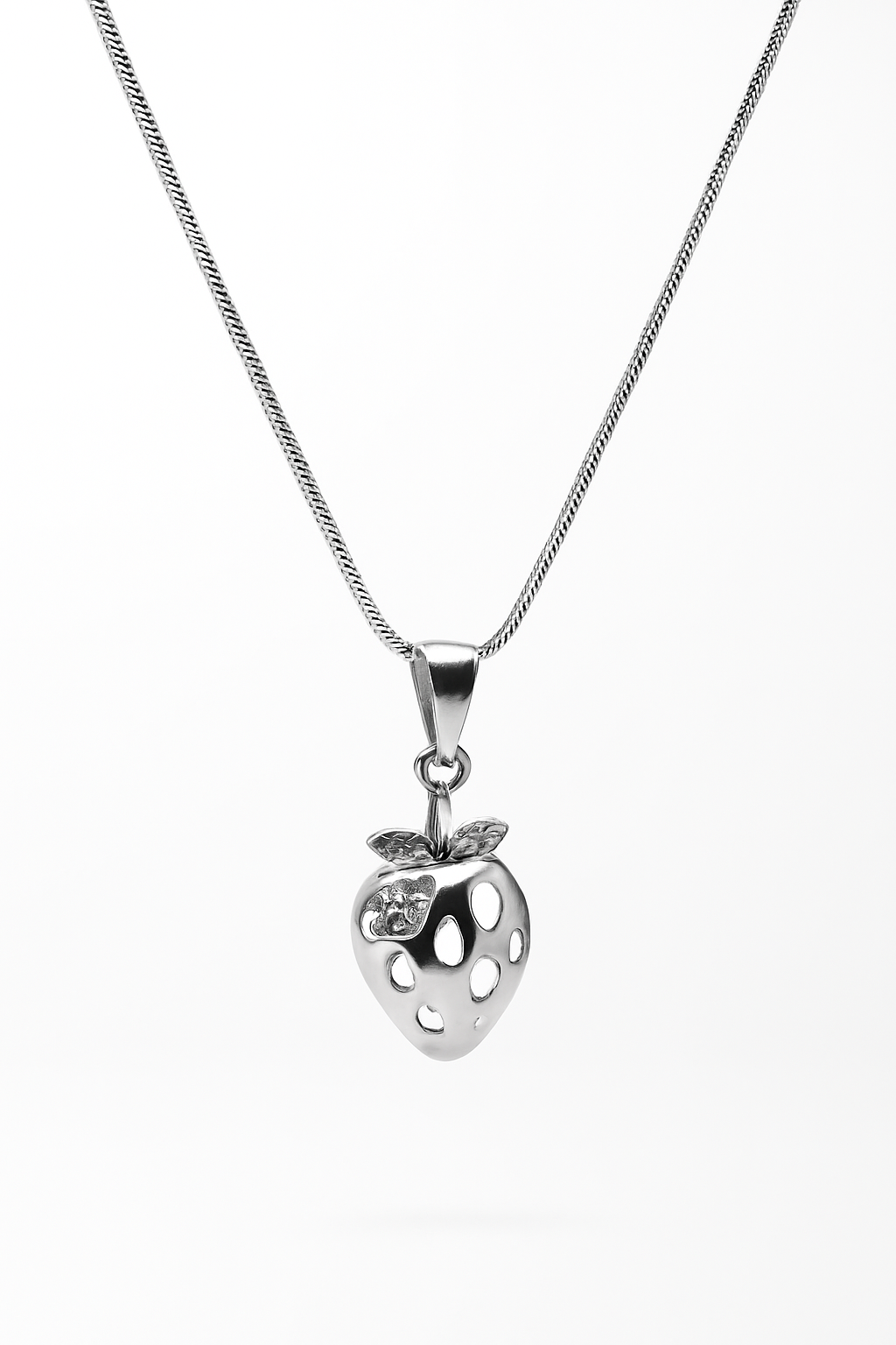 A playful strawberry-inspired pendant crafted in 925 sterling silver, detailed with...