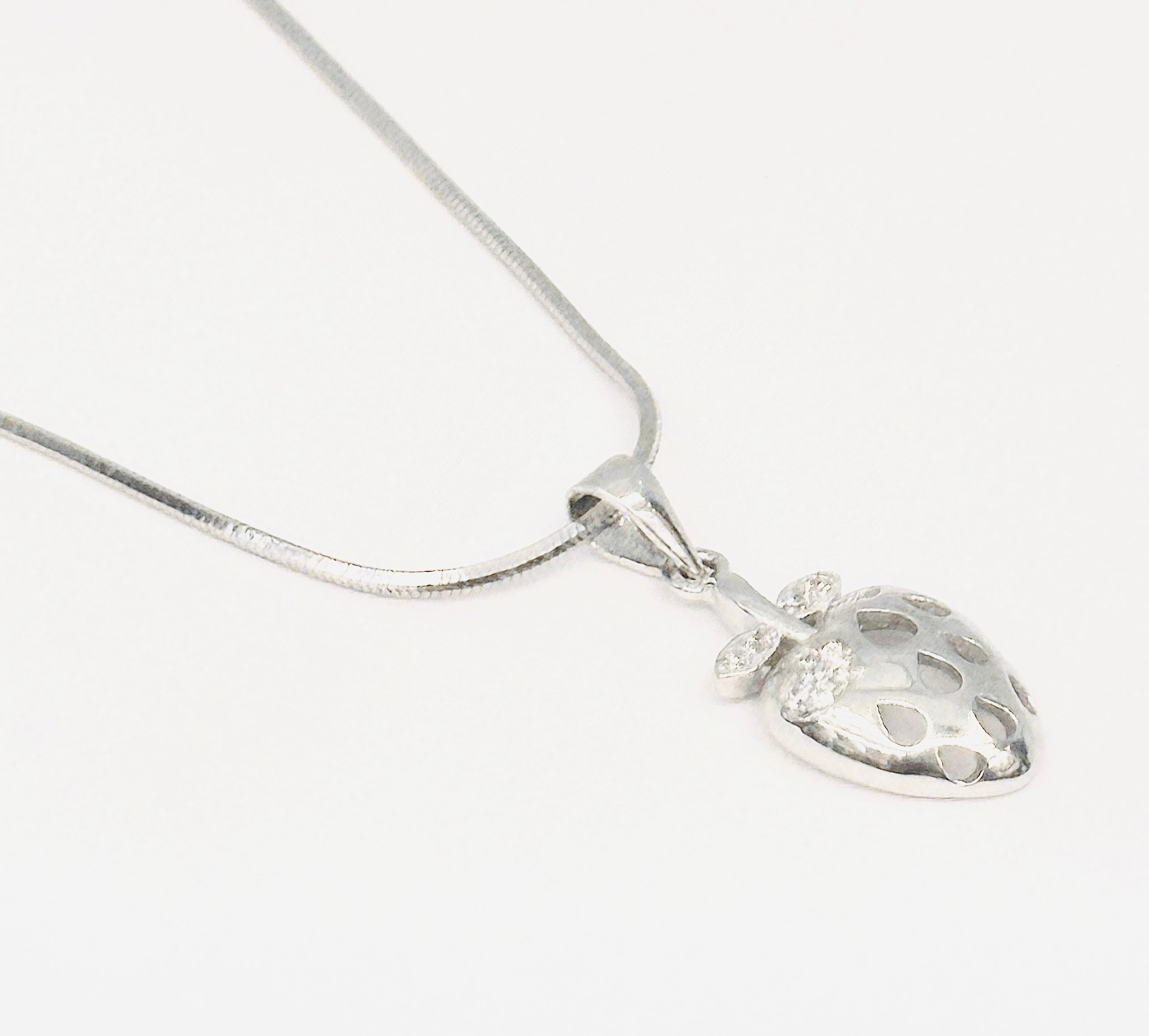 A playful strawberry-inspired pendant crafted in 925 sterling silver, detailed with cut-out seeds and shimmering cubic zirconia leaves for a fresh, fruity sparkle. Perfect for those who love jewelry with a hint of fun and sweetness.