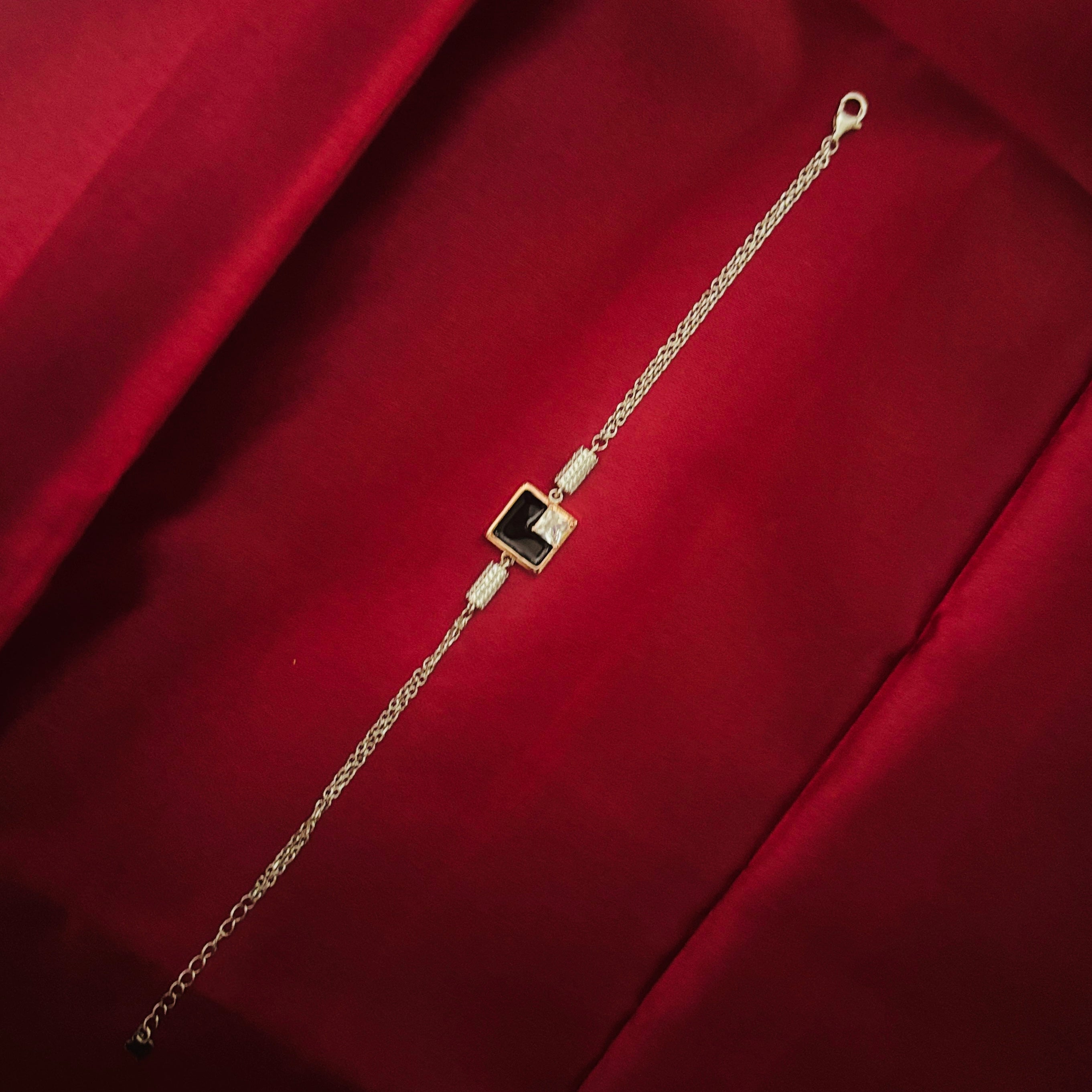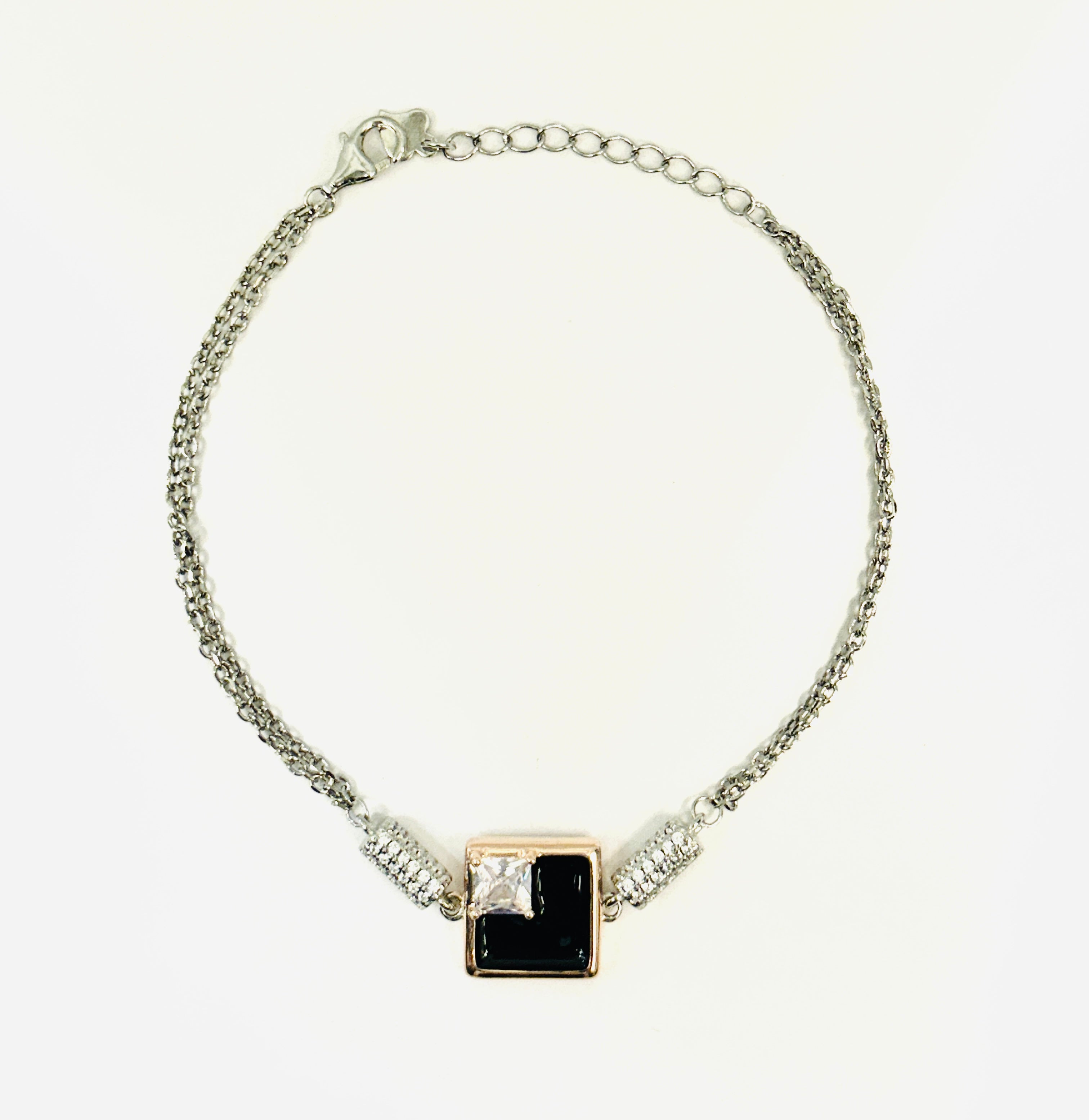 A chic bracelet featuring a dual-stone square centerpiece — glossy black and sparkling zirconia — framed in silver, with intricate micro-pave detailing on either side, symbolizing balance and style.