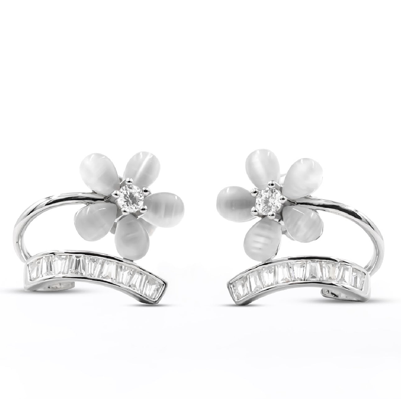Delicately crafted from pure 925 sterling silver, these charming stud earrings feature a dainty flower made from luminous mother of pearl petals with a sparkling zirconia center. Below, a graceful curved bar is set with tapered baguette-cut zirconia, adding a refined sparkle. Hypoallergenic, tarnish-resistant, and lightweight, these earrings blend soft elegance with modern design, making them perfect for daily wear or special occasions.
