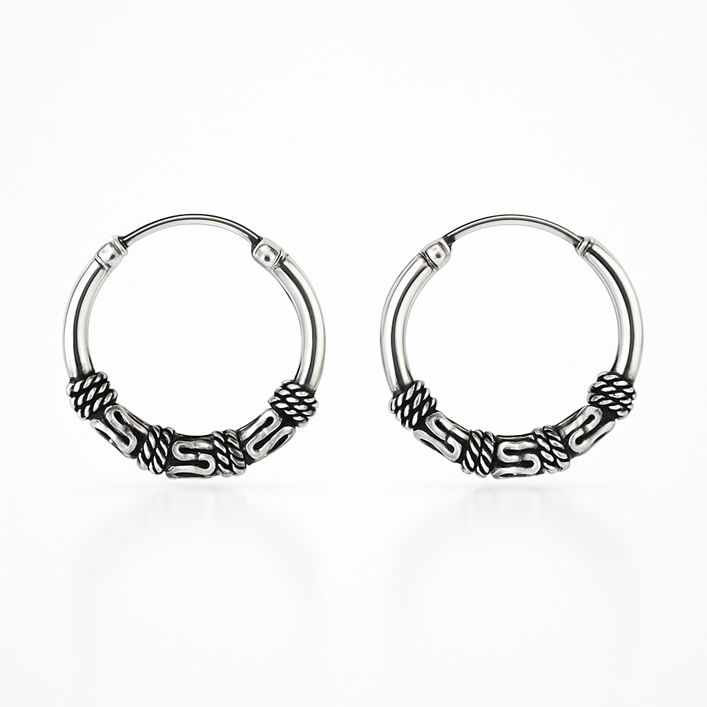 - Design: Tribal-style hoops with wire and bead motifs