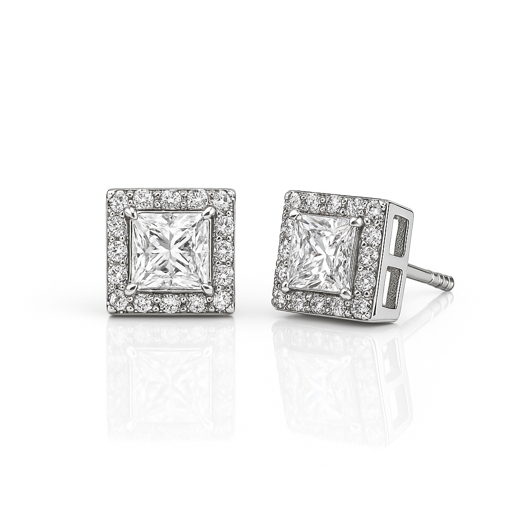 Crafted from pure 925 sterling silver, these elegant square stud earrings feature a brilliant princess-cut zirconia at the center, surrounded by a double halo of sparkling round stones. Their timeless geometric design, paired with high-polish silver, ensures a refined and radiant look. Hypoallergenic, tarnish-resistant, and lightweight, they are perfect for both daily sophistication and evening glamour.