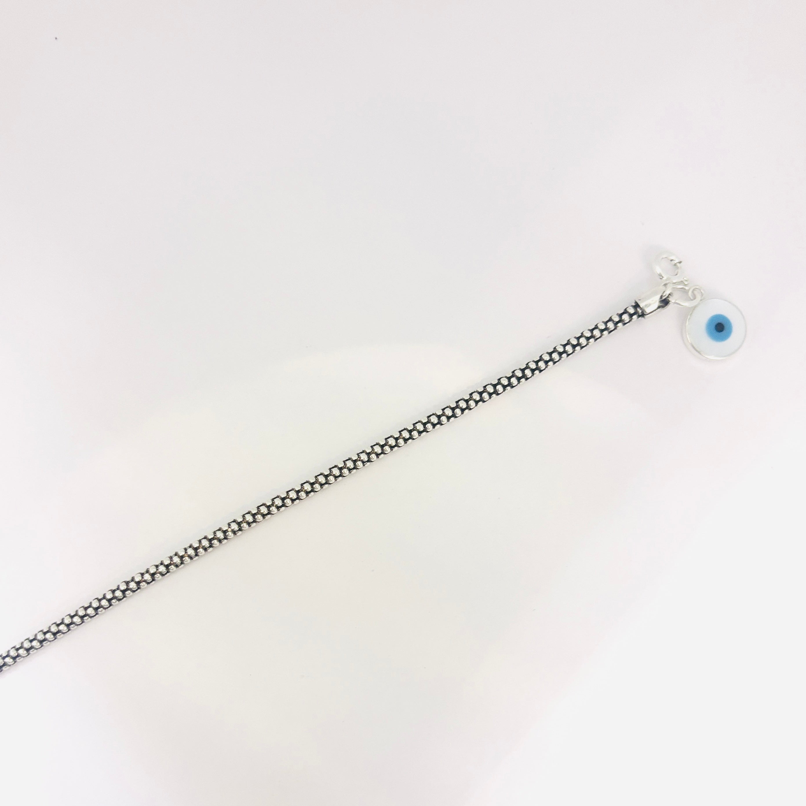 A protective yet stylish bracelet designed with an oxidised silver beaded chain and a striking evil eye charm. The bold contrast of antique finish with the blue eye centerpiece makes it both a fashion statement and a talisman for positivity.