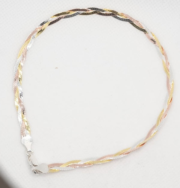 A premium Italian-style anklet featuring an intricate braided design in three tones — silver, gold, and rose gold — creating a timeless piece of jewellery that blends versatility with sophistication.