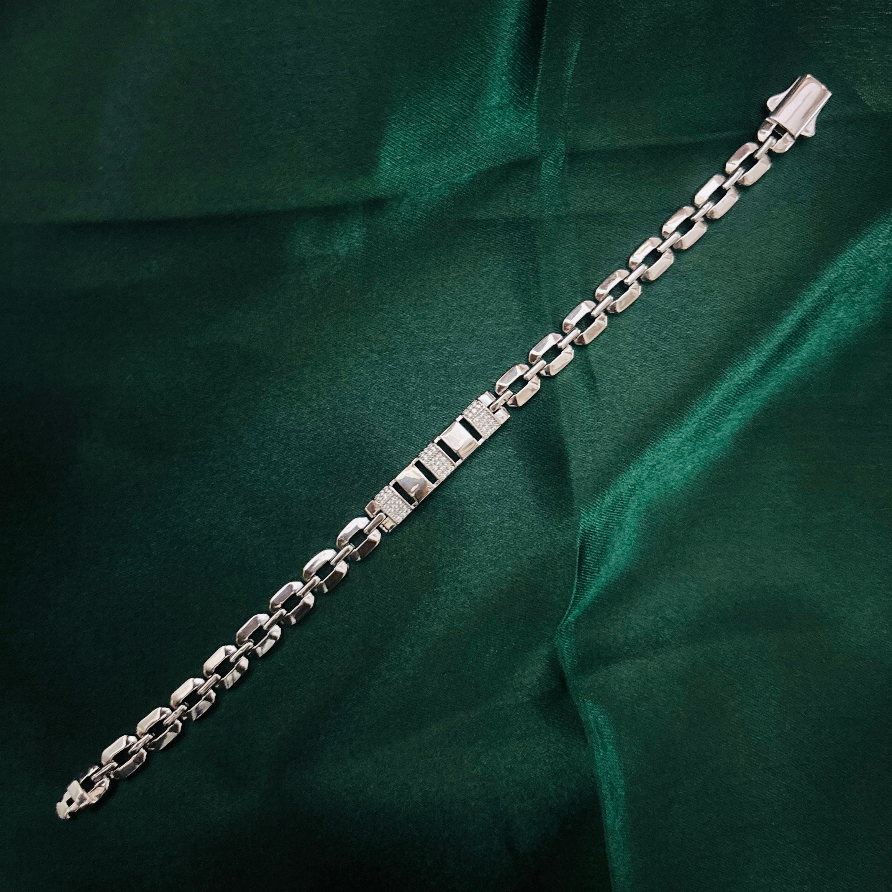 A bold and stylish men’s bracelet crafted in pure silver with strong rectangular links. The centerpiece is highlighted with shimmering cubic zirconia accents for a touch of elegance, while the solid design ensures durability and a premium look.