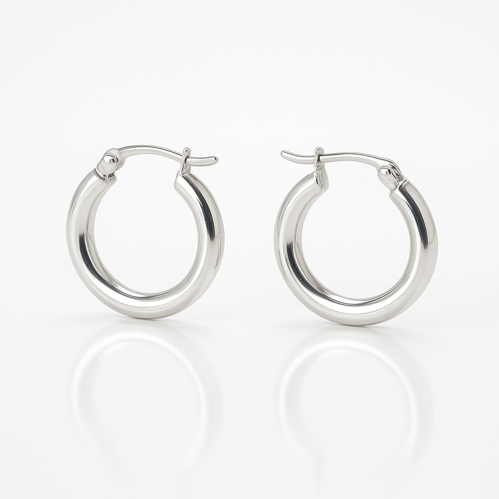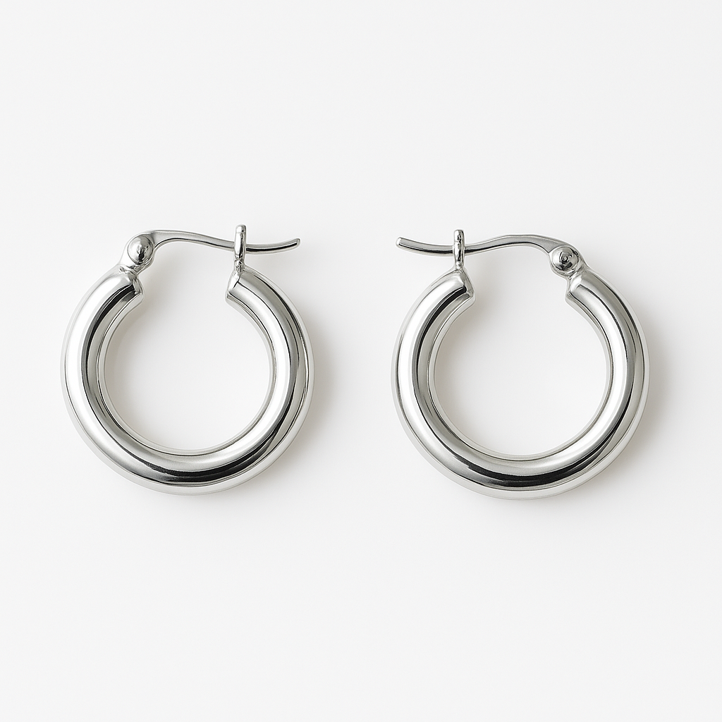 A minimalist essential, these classic silver hoop earrings are crafted in smooth polished silver for a sleek, timeless look. Their compact size makes them perfect for daily wear while still adding a refined touch to any outfit.