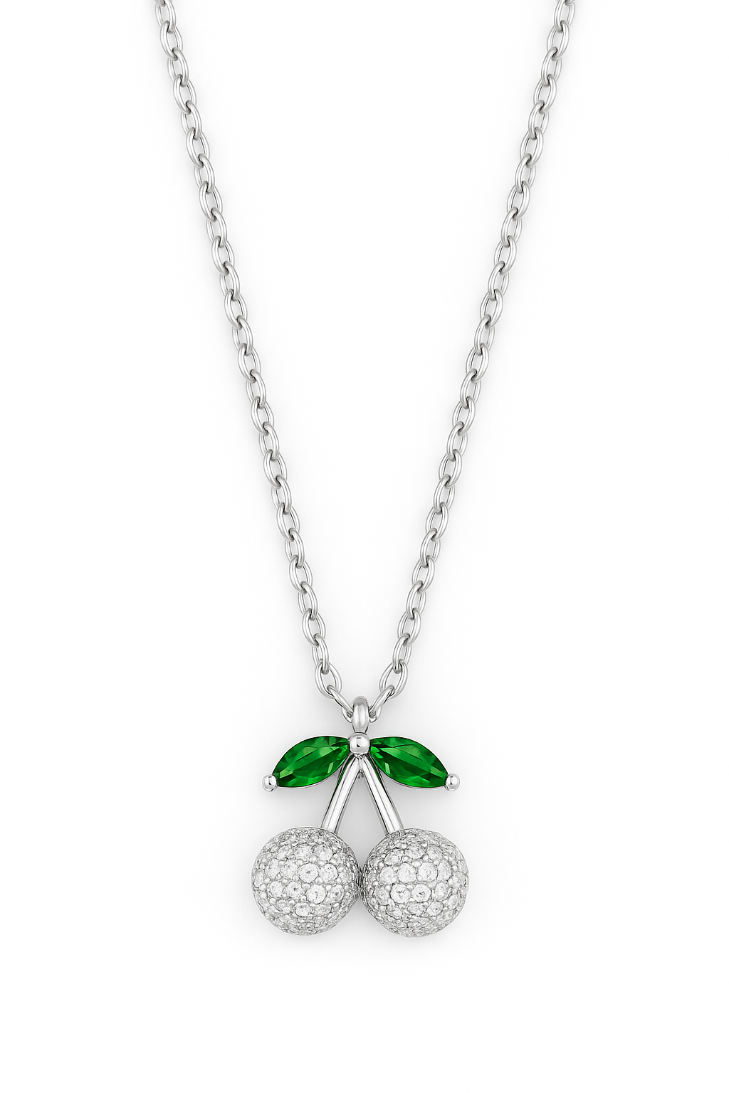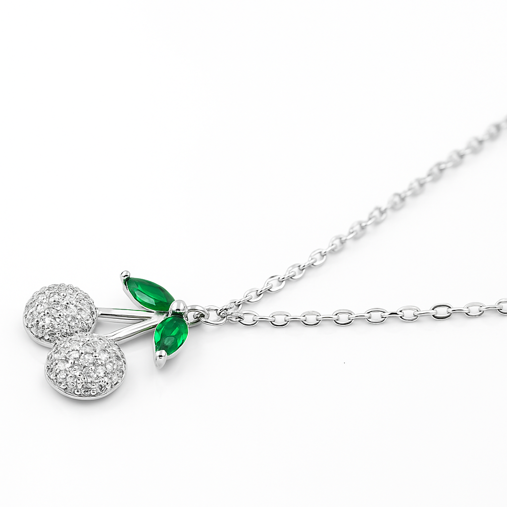 Bring a burst of sweetness to your style with this adorable cherry pendant necklace. Crafted in 925 sterling silver, the twin cherries sparkle with pavé stones while green enamel leaves add a fresh pop of color. A fun yet elegant piece that’s full of charm.