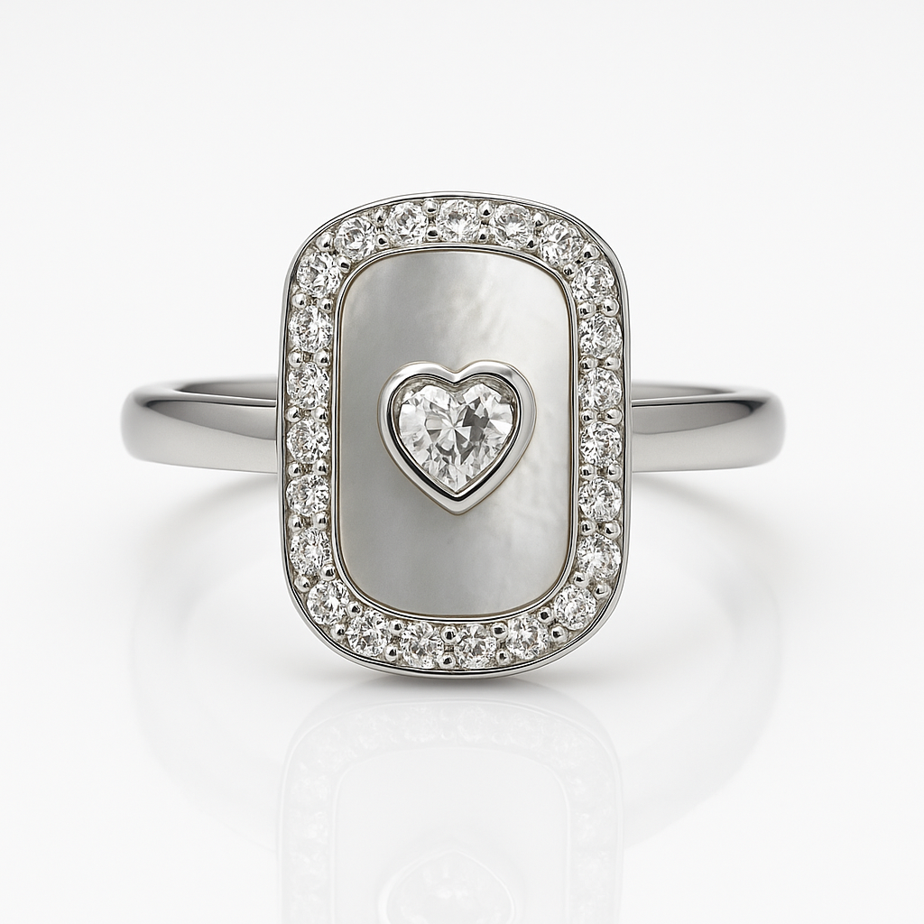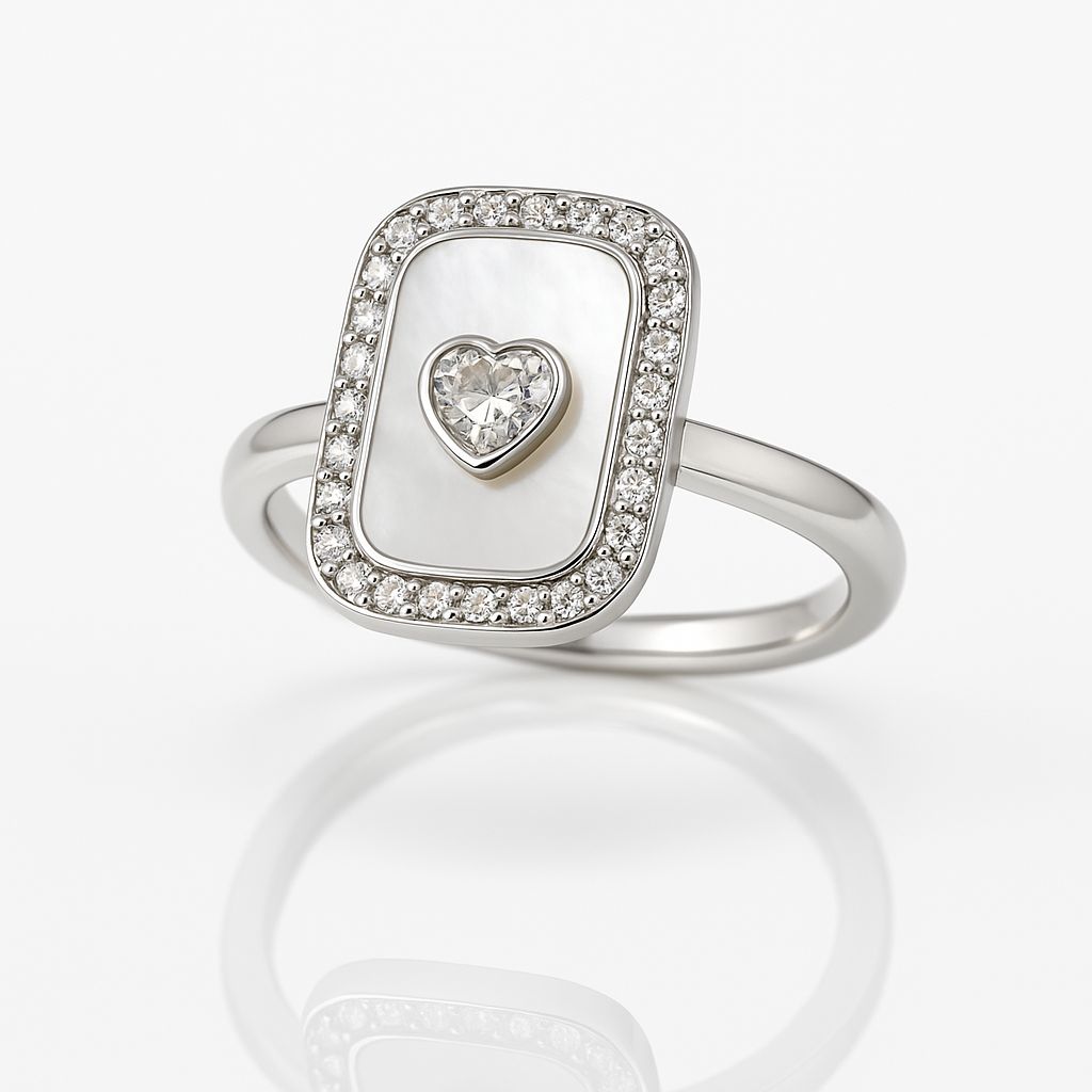 A chic adjustable ring featuring a rectangular silver frame with a sparkling heart-shaped zircon at its center, surrounded by a halo of fine zirconia. Its contemporary silhouette blends geometric elegance with romantic charm, making it perfect for daily wear or special occasions.