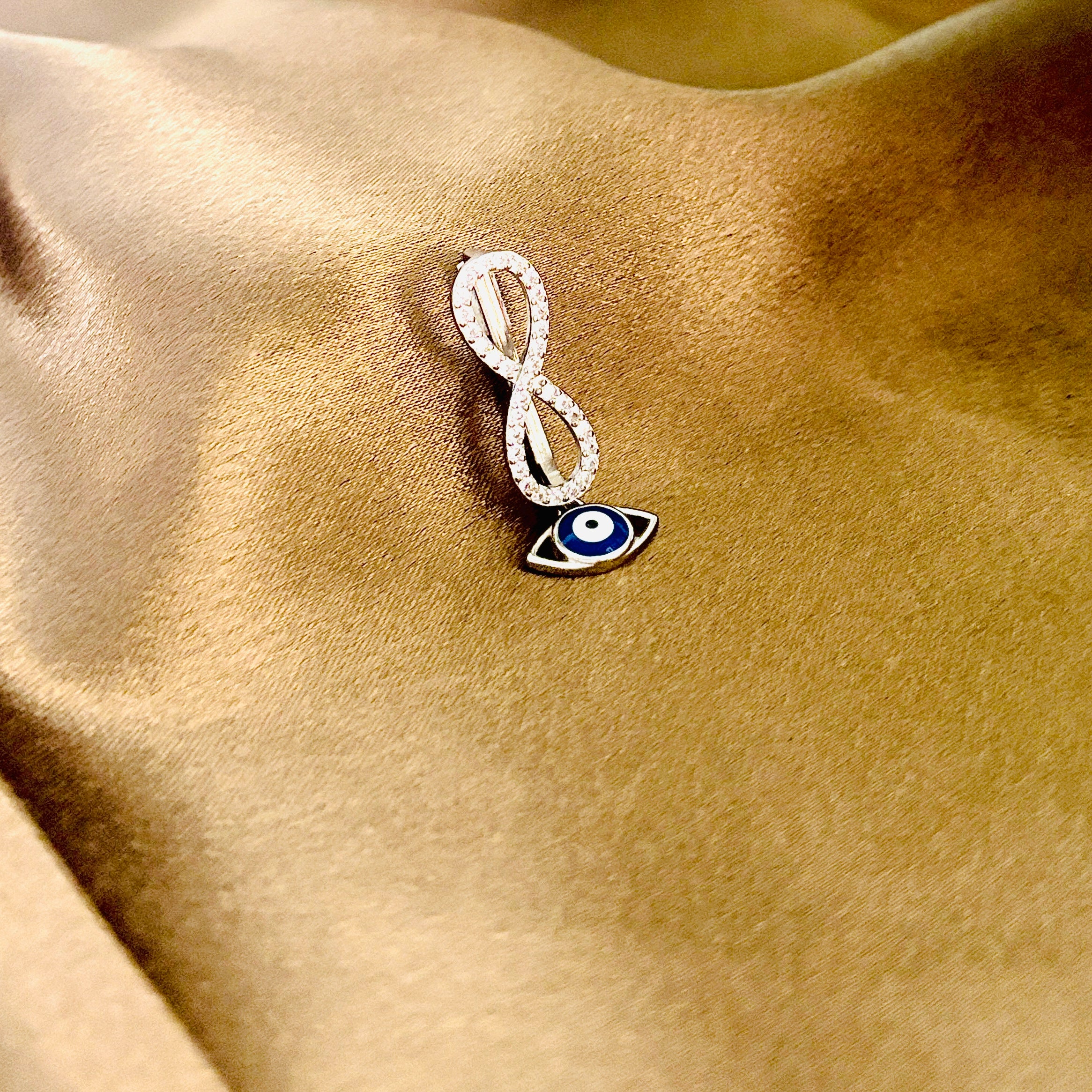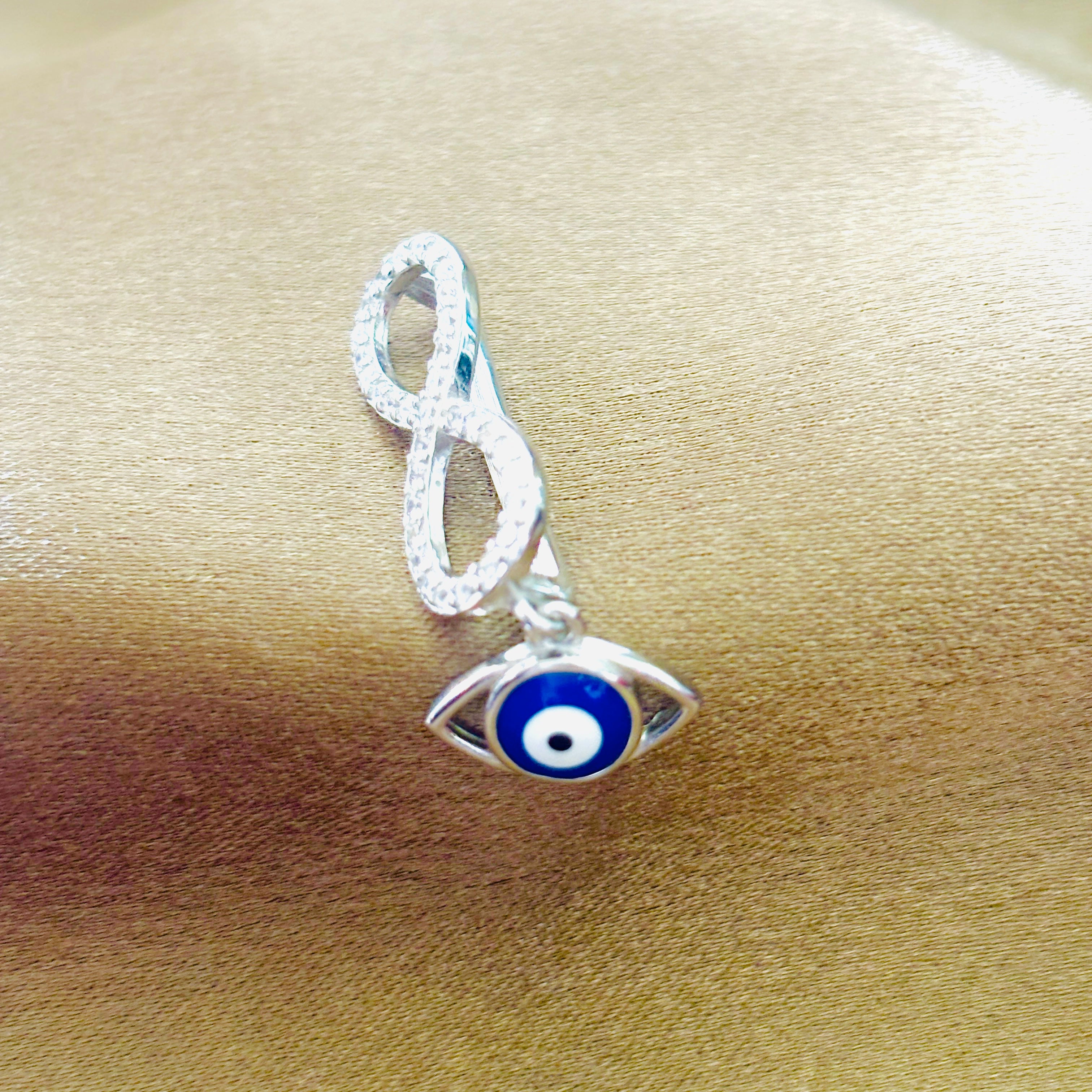 - Design: Infinity with dangling evil eye charm