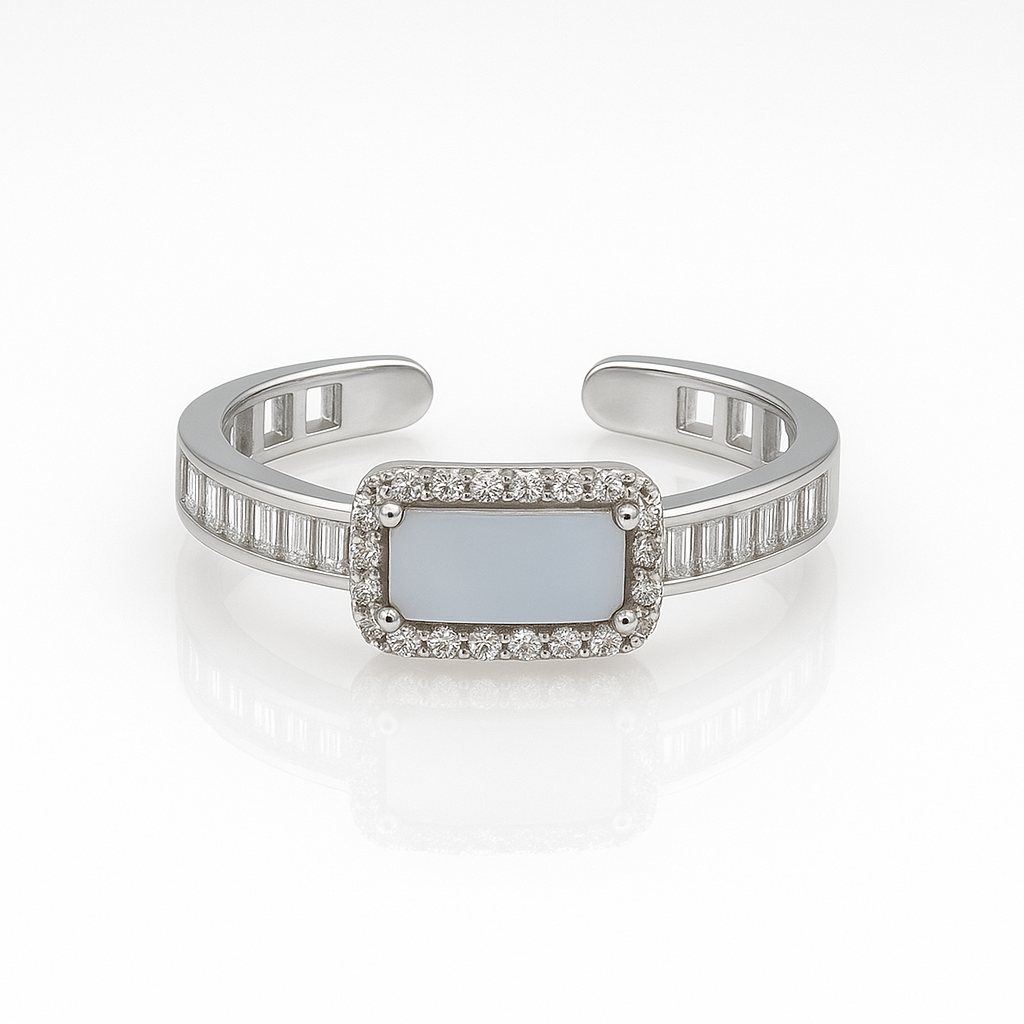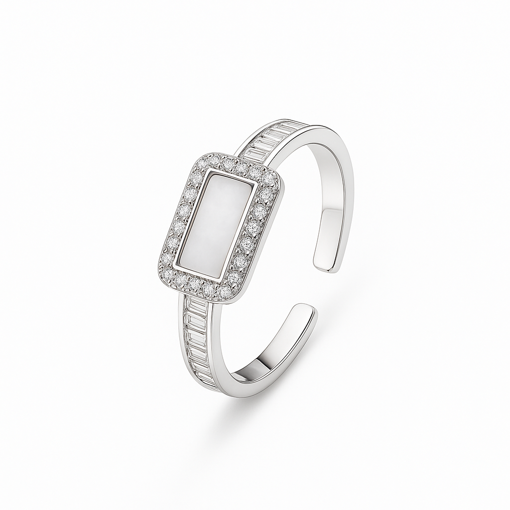 The Regal Bar ring blends modern geometry with timeless elegance. Crafted in 925 sterling silver, it features a sleek rectangular Mother of Pearl centerpiece framed by a halo of brilliant cubic zirconia. Additional baguette-cut CZ stones embellish the open adjustable band, adding refined sparkle to this versatile piece.