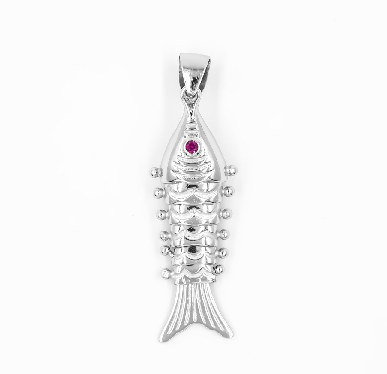 An artistic silver pendant designed in the shape of a fish with fine detailing and a tiny stone eye, symbolising prosperity, abundance, and the free flow of life.
