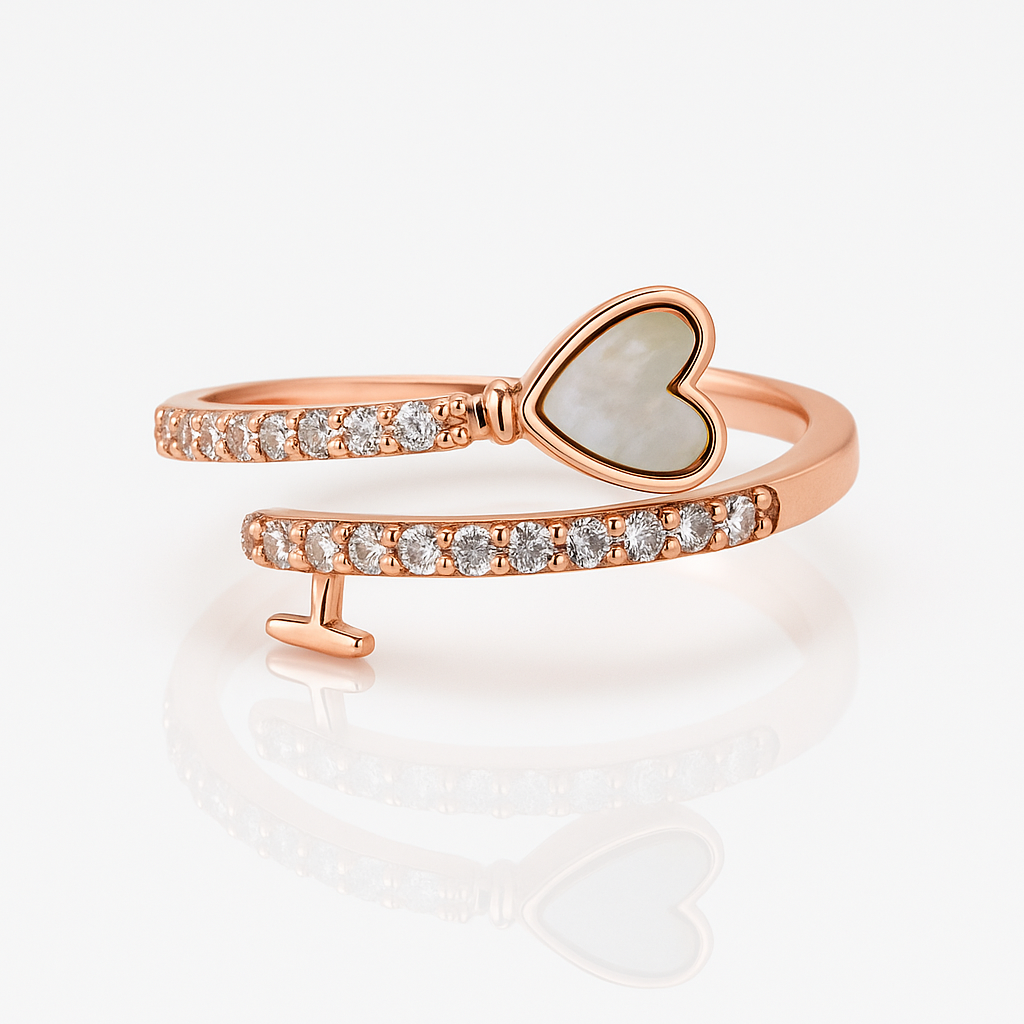 Celebrate love and elegance with our Heart Embrace Ring, crafted in high-quality 925 sterling silver and finished in a soft Rose gold tone. The open adjustable band features a sparkling row of cubic zirconia stones on each side, gracefully curving towards a polished MOP heart centerpiece. Perfect for gifting or adding a touch of romance to your everyday style, this ring offers both sophistication and sentiment.