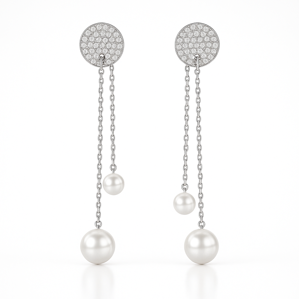 A versatile and elegant pair of dangle earrings featuring luminous pearls suspended from a sleek adjustable chain. Designed to let you style it your way — wear them long for a dramatic drop or short for a chic minimal look.