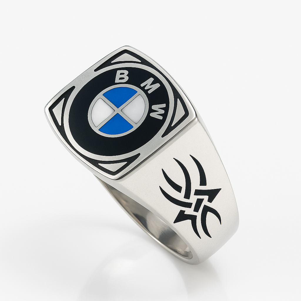 A powerful men’s ring crafted in sterling silver, featuring the iconic BMW logo at its center with sleek engravings along the band. Designed for car enthusiasts and style-forward men, this ring combines masculine strength with a passion for luxury.