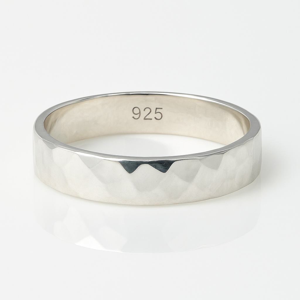 A sleek and modern band ring crafted in high-quality sterling silver, featuring a unique faceted texture that catches the light from every angle. Perfect for everyday elegance or as a statement stacker.