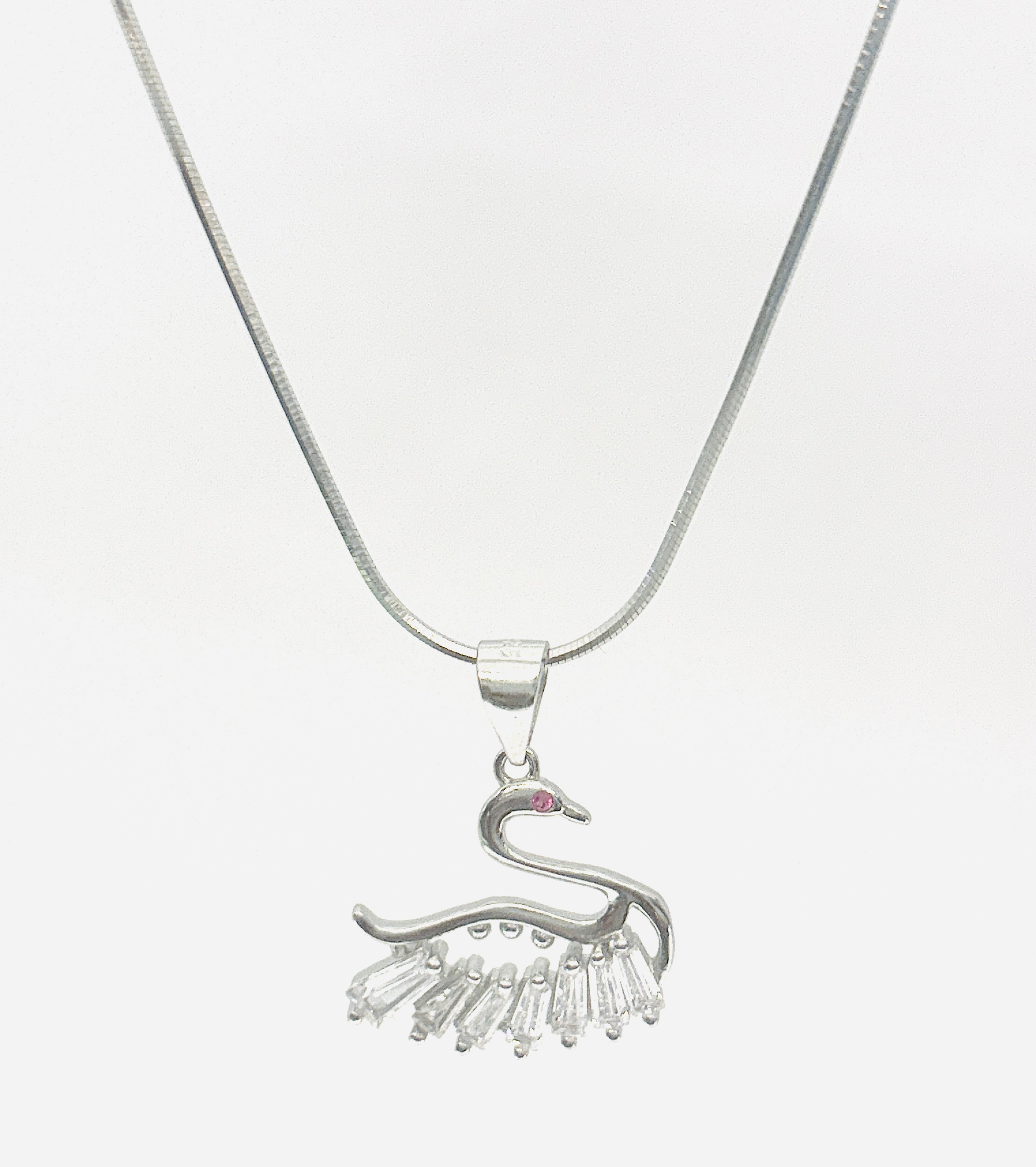 A delicate swan pendant that symbolizes elegance and serenity, this necklace is a timeless piece for everyday grace. The pendant features a swan crafted with fine detailing, highlighted by baguette-cut stones that form its flowing feathers. Perfect for those who love a touch of charm and sophistication.