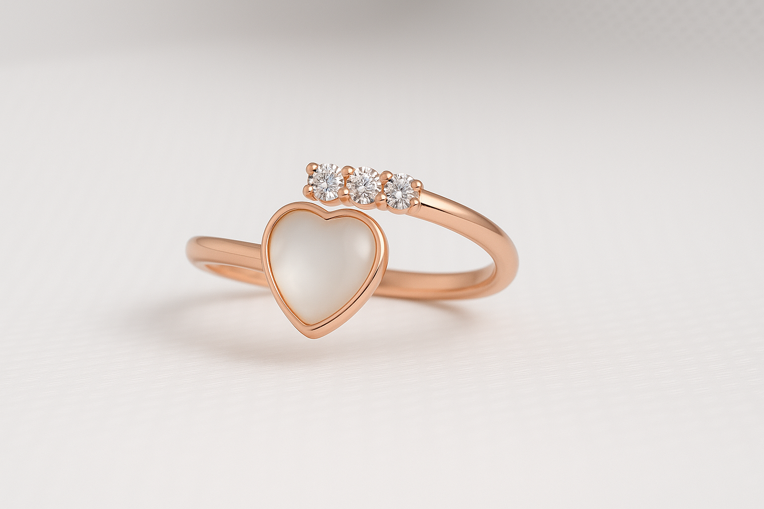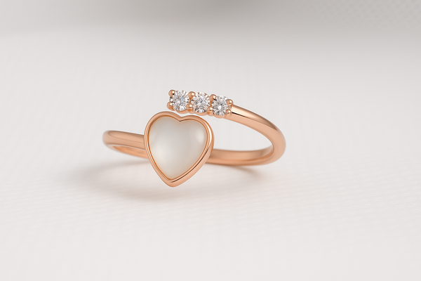 A soft expression of romance, this Moonlit Heart ring is crafted from genuine 925 sterling silver. The centerpiece features a delicate heart-shaped Mother of Pearl, radiating a subtle iridescence. On the opposite side, a trio of sparkling cubic zirconia stones adds balance and brilliance. Lightweight and minimalist, this open-band design is perfect for everyday wear or as a sweet accessory for date nights.
