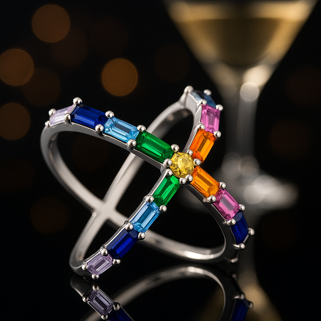 A bold and artistic “X” shaped ring crafted in sterling silver, adorned with vibrant multicolor baguette-cut stones and a sparkling zircon centerpiece. The unique design allows this ring to be worn from all four sides, giving you a fresh, versatile look every time. A modern fusion of geometry and colour, it’s a true statement piece.
