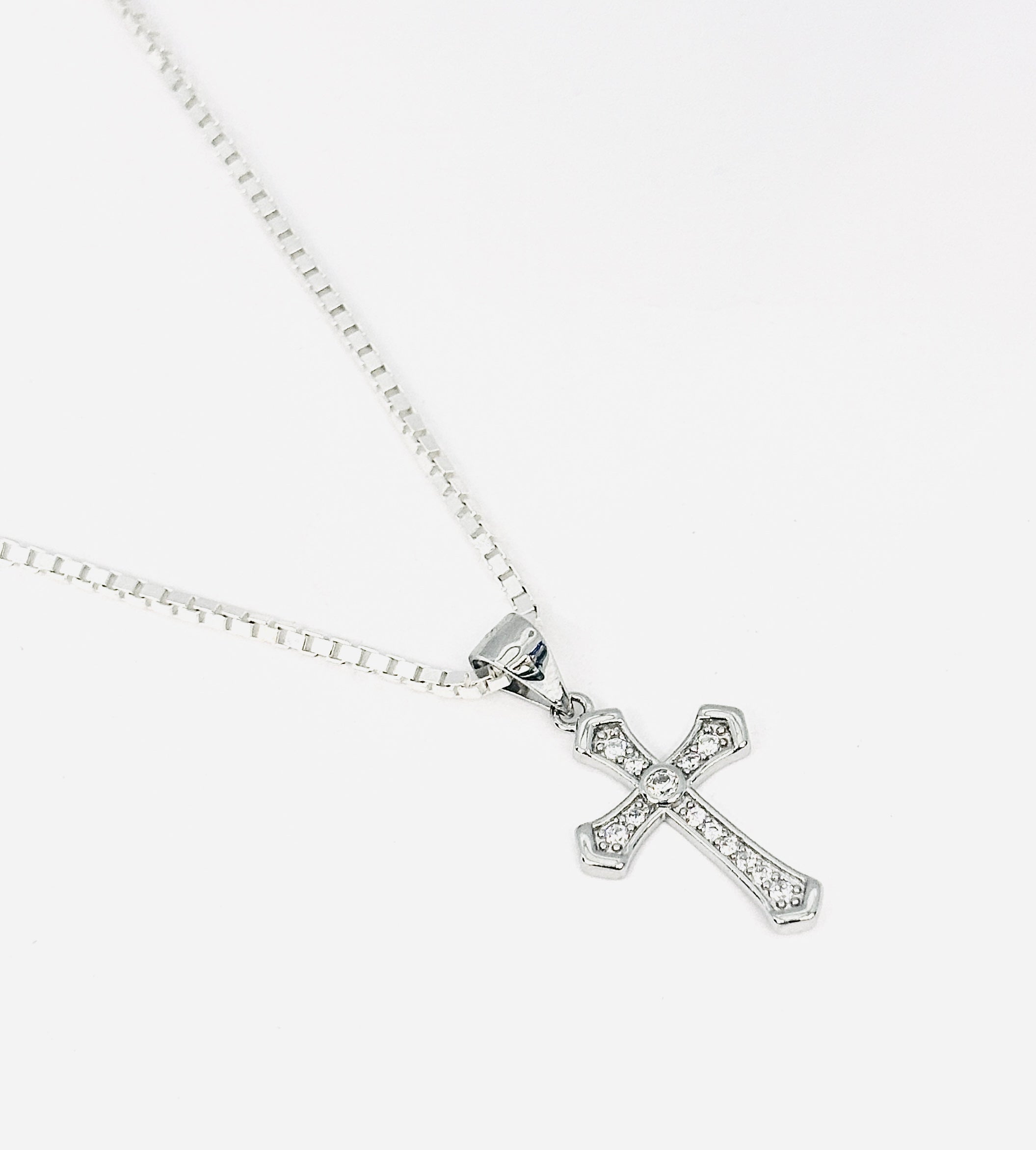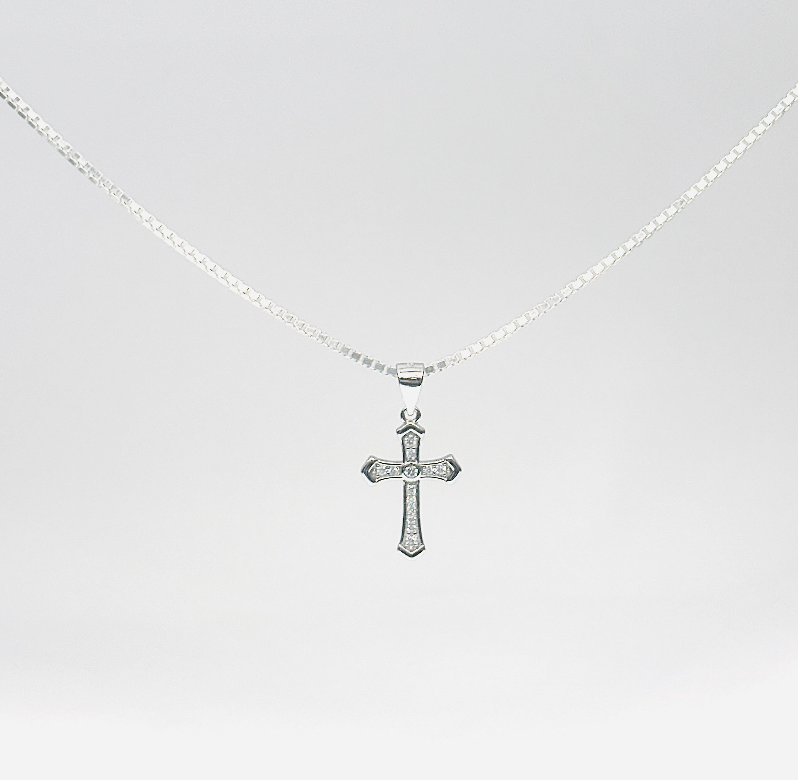 - Design: Classic cross pendant with detailed shine