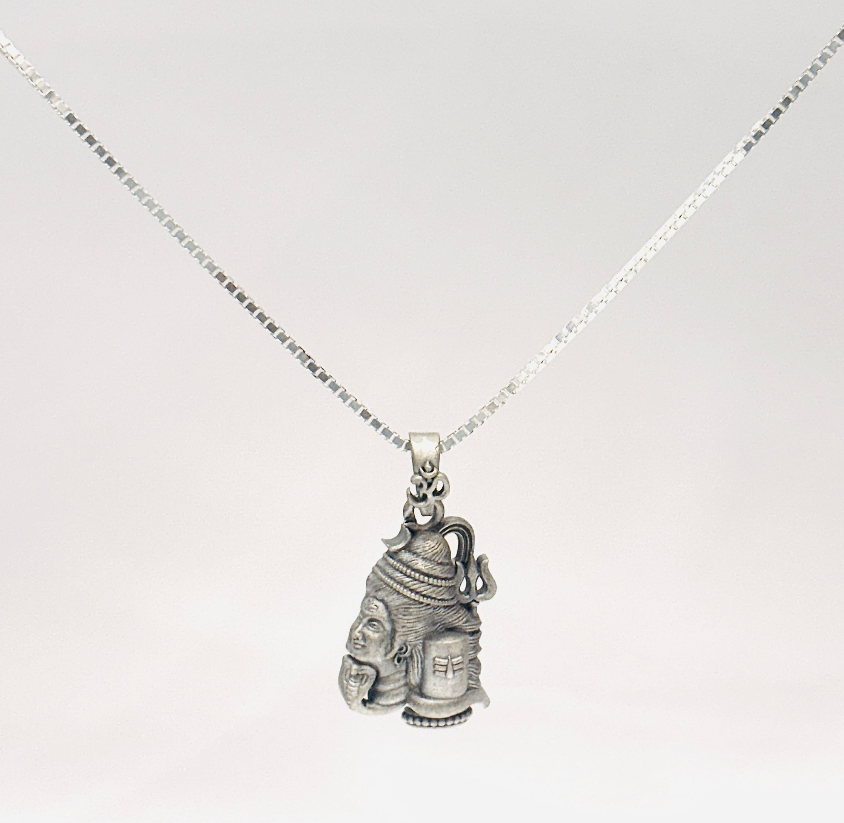 This powerful pendant features Lord Shiv Ji with a detailed Trishul and Shivlinga design, crafted in 925 sterling silver. Paired with a sturdy box chain, it embodies devotion, strength, and timeless artistry. Perfect for men seeking a divine and spiritual accessory that also makes a bold style statement.