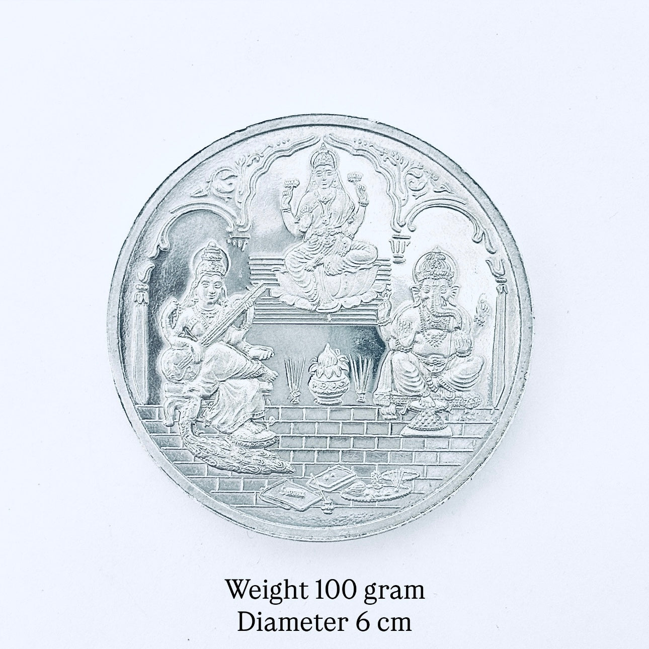 100 gram Pure Silver Coin – Lakshmiji Ganeshji Saraswatiji Design