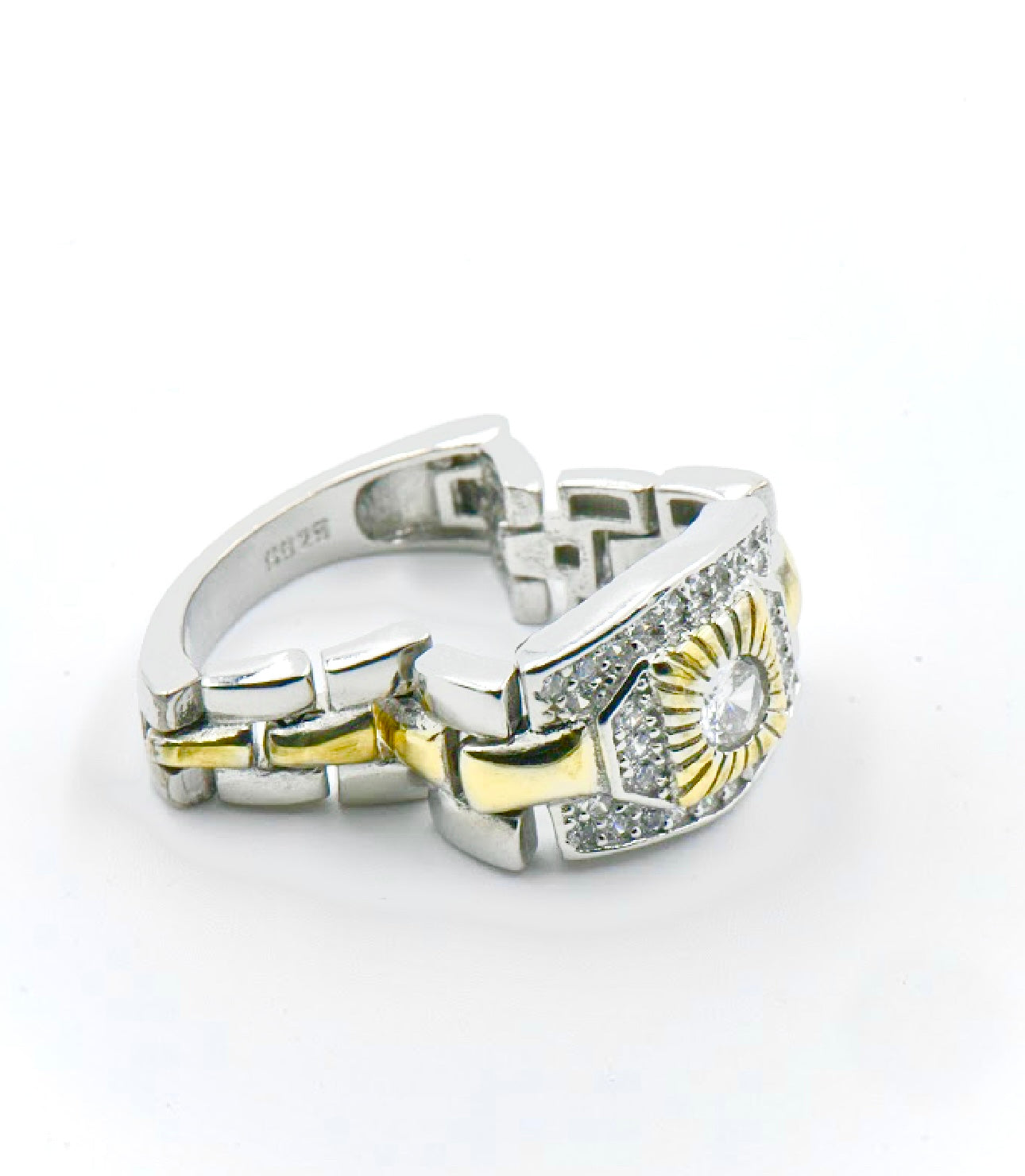 A striking men’s ring designed with a flexible Rolex-style band, combining strength with comfort. The centerpiece features a radiant zircon set against a golden sunburst pattern, bordered with shimmering stones for a luxurious finish. Its dual-tone design makes it an exceptional statement accessory.