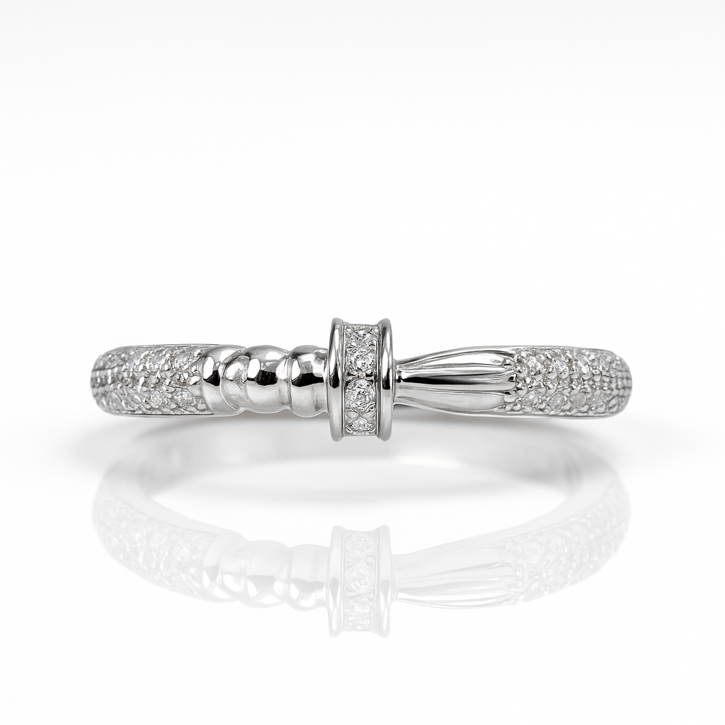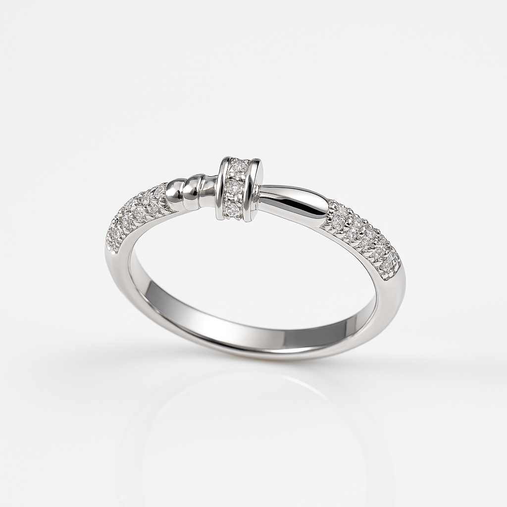 A bold yet feminine statement piece inspired by the strength of a nail and hammer design, elevated with sparkling cubic zirconia. The sleek band curves gracefully around the finger, blending modern edge with elegance.
