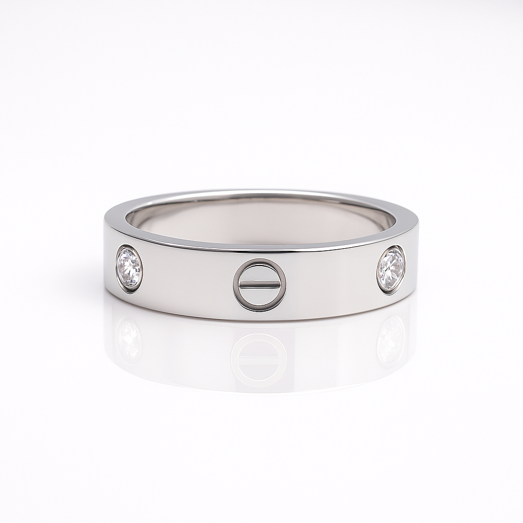 A sleek and sophisticated Cartier-inspired band, crafted in high-polish sterling silver and adorned with a single dazzling diamond at the center. Engraved screw motifs on the shank add a touch of modern edge to its classic elegance.
