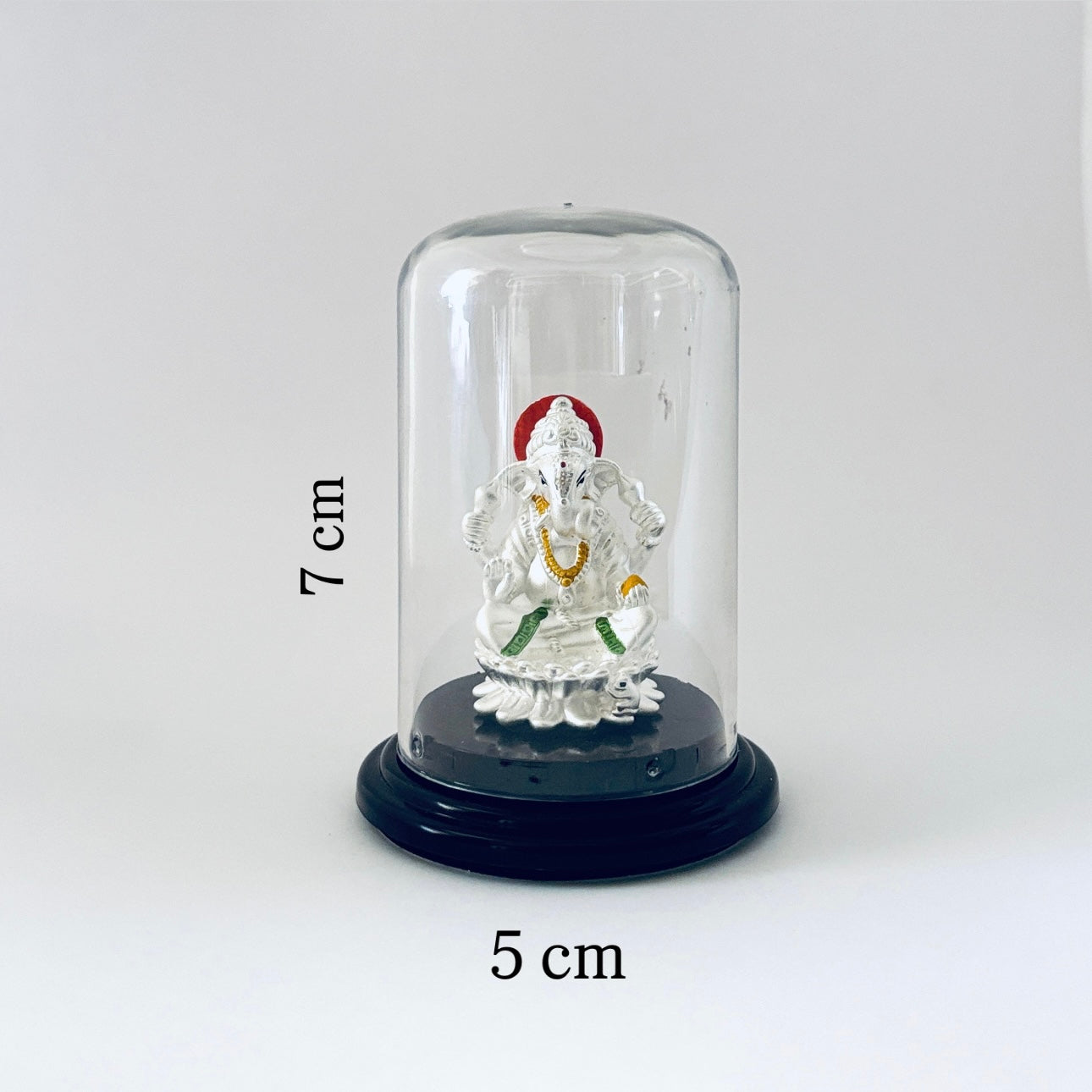 Invoke divine blessings and prosperity into your home with this exquisite Emerald 999 Pure Silver Ganesha Murti. Crafted from 99.9% pure silver, this idol beautifully captures Lord Ganesha in a seated pose symbolizing wisdom, success, and good fortune. The intricate detailing, highlighted with subtle emerald green and gold accents, enhances its spiritual charm and elegance.Encased in a protective transparent dome with a sturdy black base, this murti stays safe from dust and retains its shine for years. Ideal for home temples, office desks, car dashboards, or as a thoughtful gift for auspicious occasions like Diwali, Ganesh Chaturthi, weddings, and housewarmings.